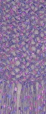 Materials:3 balls KFI Dazzle, size 9 needle Gauge: ~3 sts = 1 inch over pattern st. Size: 3¼" x 50", before fringing. Fringe: Cut 52 strands of Dazzle, each 16" long. Set aside.